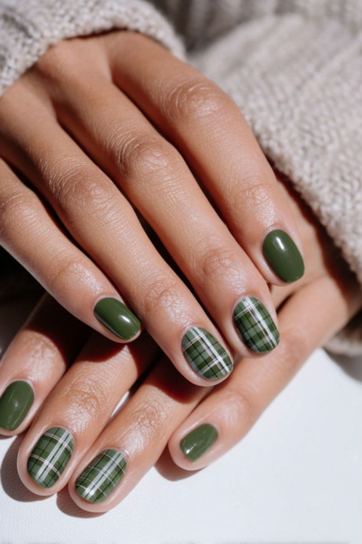 Classic with a twist, this manicure combines solid olive nails with plaid accents. The short rounded shape makes it ultra-practical, perfect for typing, everyday errands, or casual gatherings. This look is especially appealing for students or professionals who want something understated yet stylish.