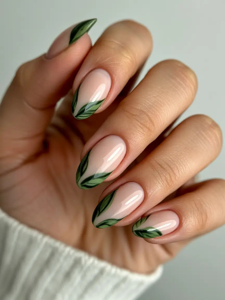 Finally, a breath of fresh air: a nude base with soft leafy tips in layered mint and forest hues. This look is delicate, botanical, and utterly enchanting. The almond shape makes it feel graceful, while the light base keeps it versatile. Great for eco-chic events, creative industries, or simply someone who loves subtle art that whispers rather than shouts.