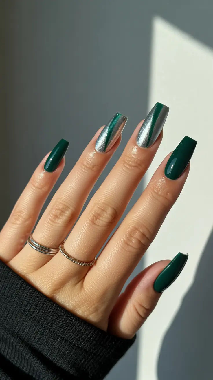 This look pairs deep emerald with liquid chrome, creating a futuristic edge perfect for nights out or winter parties. The square nail shape keeps it sharp and chic, balancing boldness with wearability. It’s a versatile choice, especially flattering on longer fingers, though less practical for those in hands-on jobs. Think of it as your go-to manicure for cocktails, fashion events, or when you want to elevate a simple black sweater.