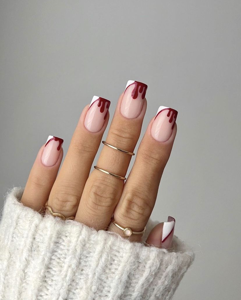 This set puts a dark twist on the traditional French manicure. Instead of crisp tips, crimson drips cascade over a pale nude base, creating a red and black-inspired design that’s edgy yet classy. The design works beautifully on square short nails because the flat tips enhance the drama of the dripping detail. It’s versatile enough to wear out for a Halloween party but still subtle enough for work—though it might feel a little too bold for very conservative settings.