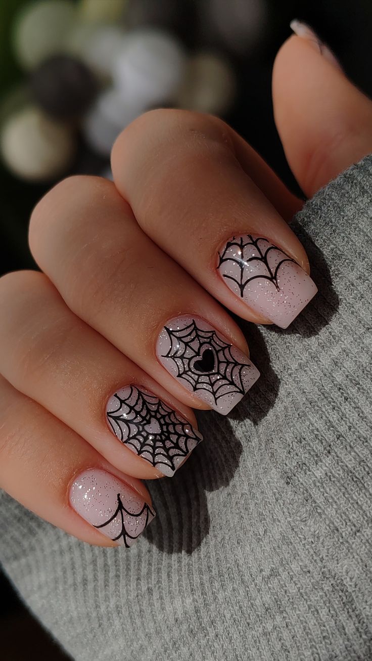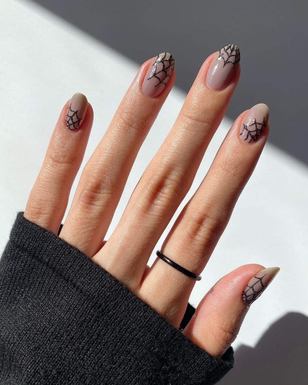 Spider webs take a witchy turn here, painted over a delicate nude base with a hint of sparkle. The contrast of black detail lines on a soft background makes it both classy and subtle, showing that Halloween nails don’t have to scream to be effective. This design is great for anyone with a professional schedule who still wants to sneak in a seasonal touch. It’s also flattering for wide nail beds, as the webbing elongates the look.
