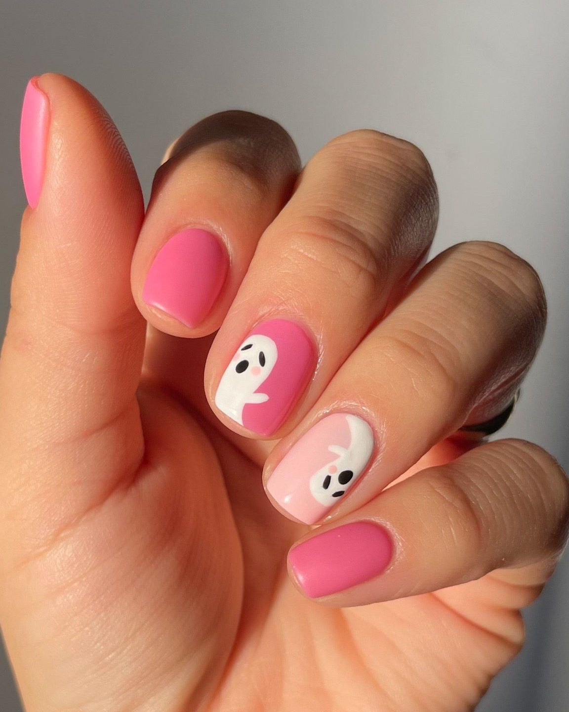 Who said Halloween nails can’t be girly? This set takes the classic ghost motif and softens it with a pink base, making it cute and approachable rather than chilling. It’s a fantastic choice if you love festive details but want something that still blends with everyday outfits. This look works best for short nails since the playful design doesn’t need length to shine.