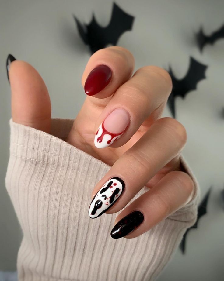 Taking inspiration from horror films, this look combines red and black with a dripping blood effect and a scream mask. It’s bold, spooky, and perfect for anyone leaning into full Halloween drama. This style is less about subtle elegance and more about having nails that start conversations. Best suited for costume parties, but it might feel heavy for everyday wear if you like simple looks.