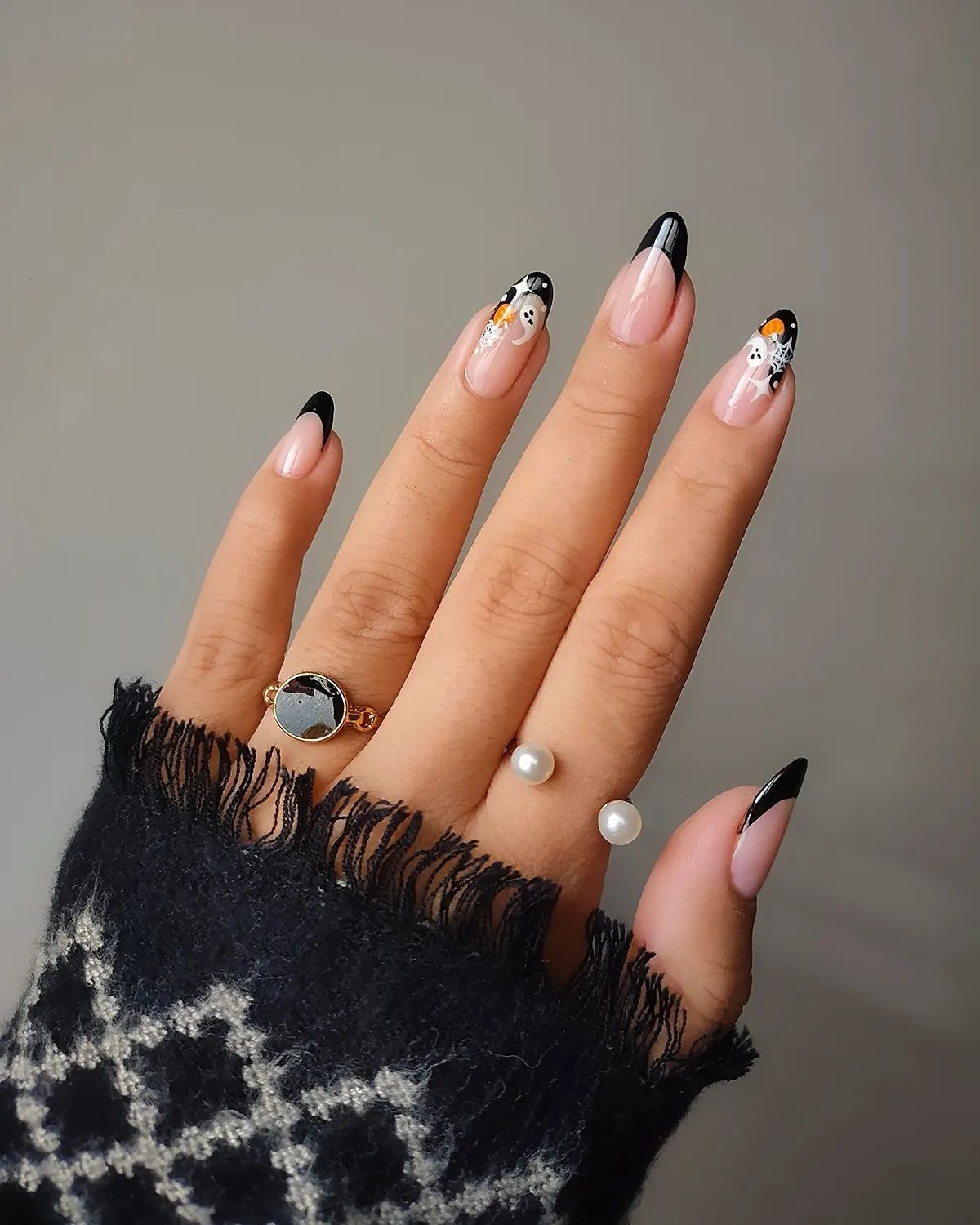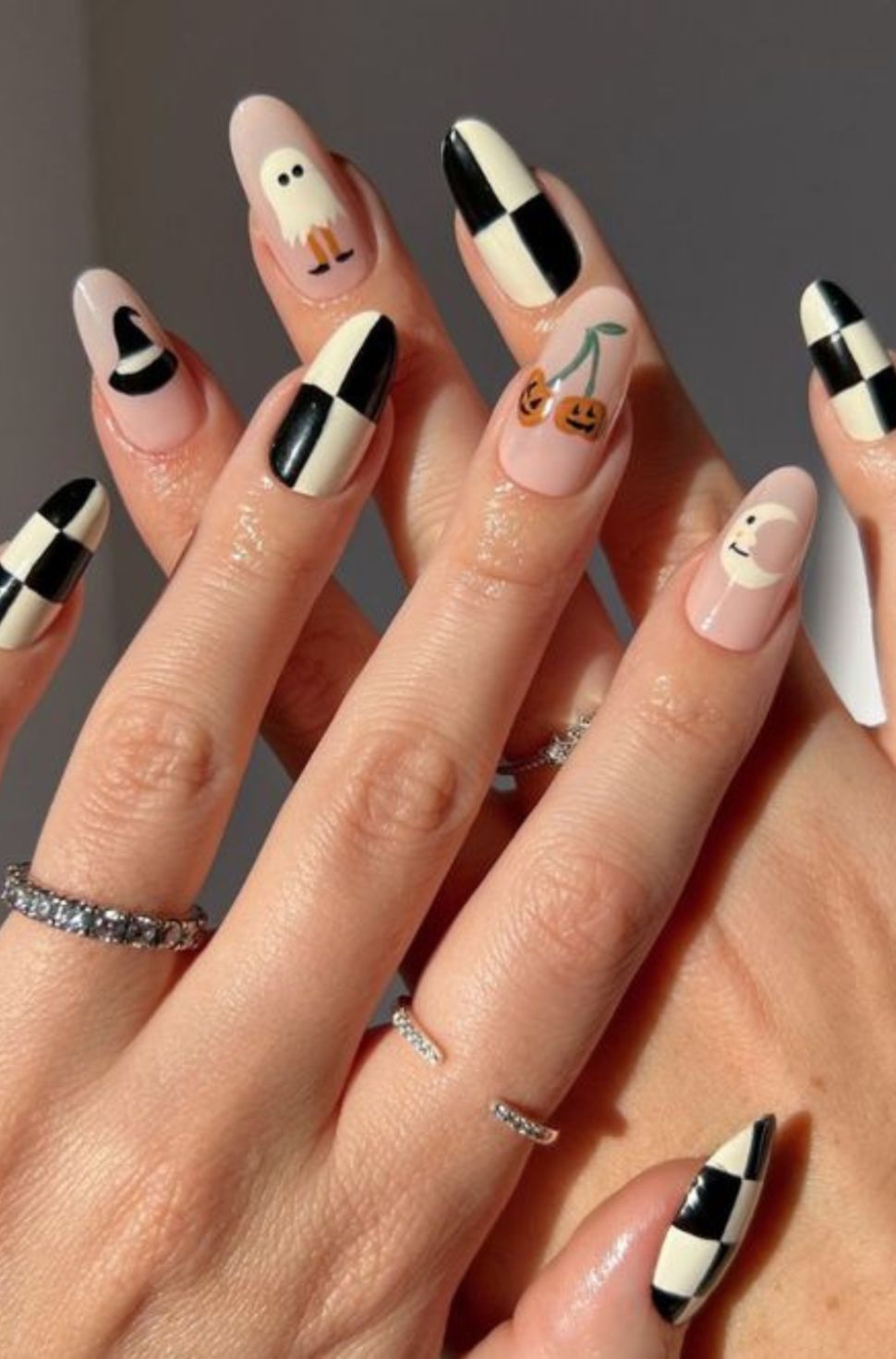 This one feels like a collage of everything spooky and fun—witch hats, pumpkins, ghosts, and bold black and white checkered tips. It’s the ultimate girly set for someone who loves mixing cute art with solid colors. It’s definitely on the more graphic side, best for parties or social events rather than professional environments. On short almond or rounded nails, it keeps its playfulness without feeling heavy.