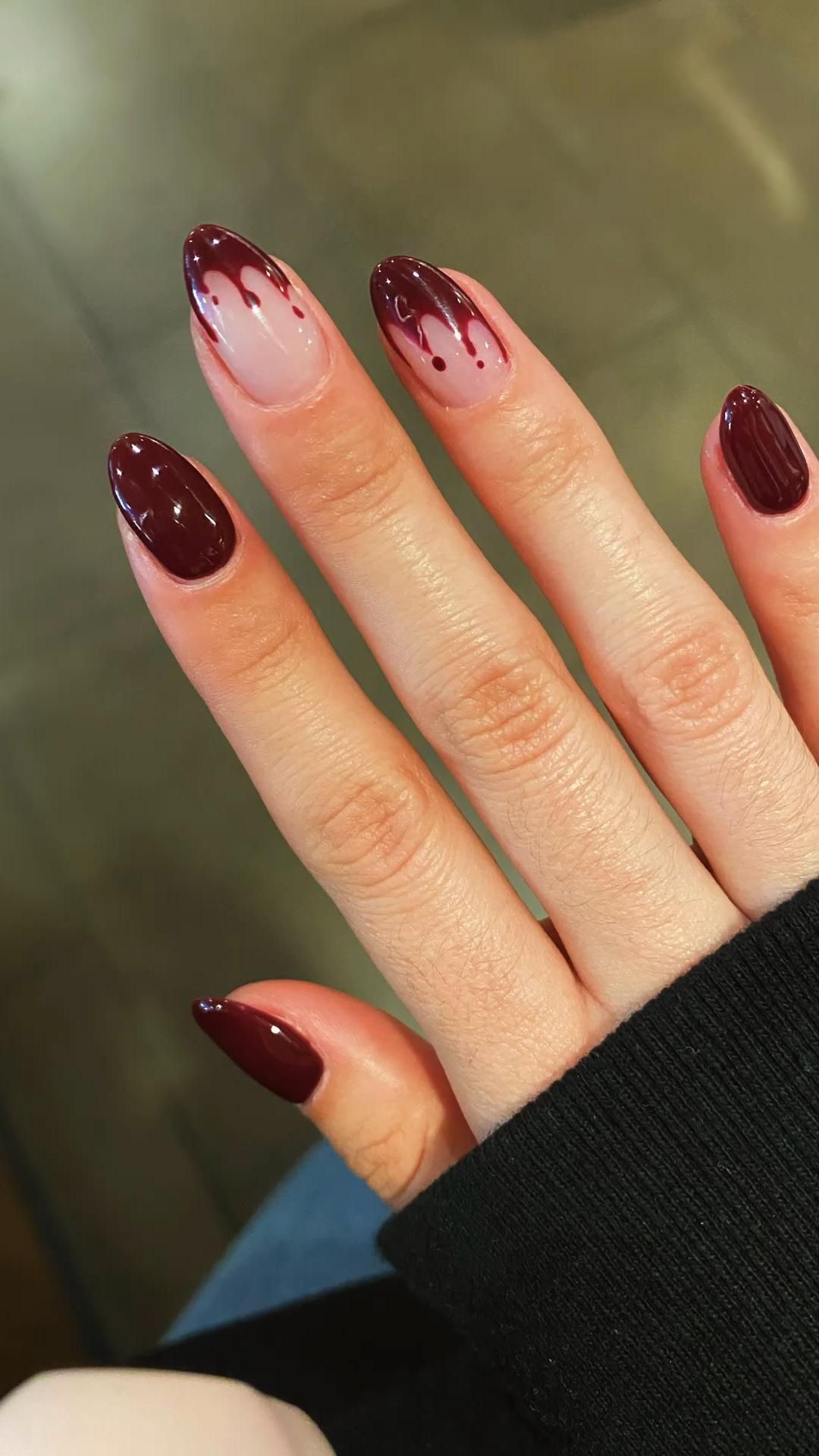 This design captures the essence of spooky minimalism. A soft nude base with dripping red and black polish makes it look like elegant blood art. It’s striking but simple, a perfect option for short nails that don’t need much length to make a statement. This is an everyday-friendly spooky manicure — edgy enough for the season but not overwhelming.