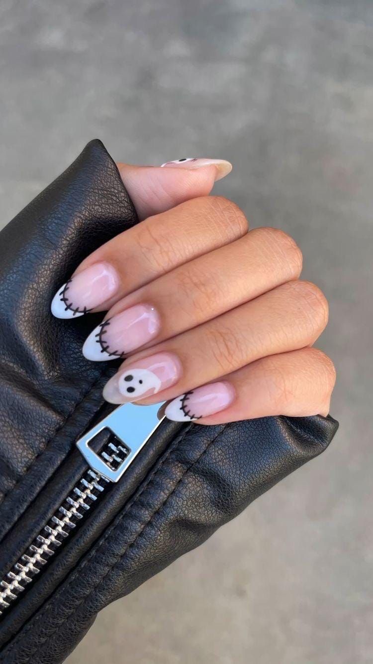 This set screams Nightmare Before Christmas energy. Soft pinkish nude bases carry stitched French tips, with a playful ghost character for a touch of spooky fun. It’s girly and playful while nodding to one of the most beloved Halloween themes. Perfect for casual outings or themed movie nights, but maybe less fitting in ultra-formal settings.