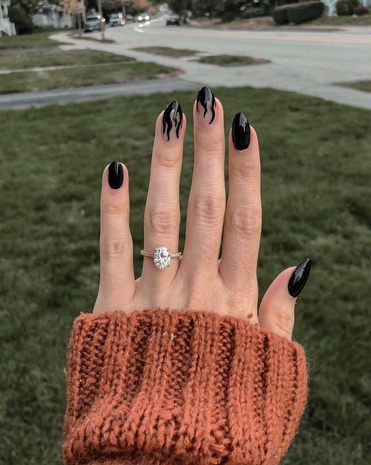 For lovers of solid colors, this set uses pure black polish with flame-like accents rising from the tips. It’s edgy, bold, and effortlessly classy in its own way. With short, sharp almond nails, it elongates the fingers while keeping them wearable. This one is perfect for anyone who doesn’t want cartoons or pumpkins but still wants a dramatic spooky vibe.