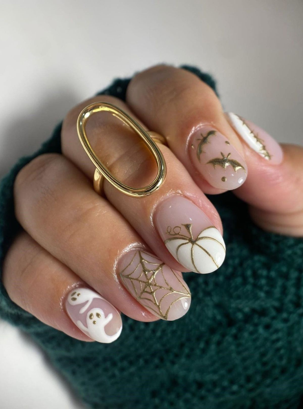 This one blends elegance with fun, layering delicate gold spider webs, pumpkins, ghosts, and bats over a natural nude base. It feels more classy than kitschy, making it ideal for anyone who loves Halloween but still wants their nails polished enough for dinner parties or work settings. Short square nails keep it neat and refined.