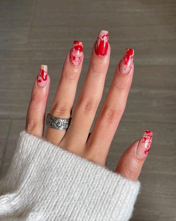 Pure spooky gore chic. This design uses nude nails splattered with red and black-toned paint strokes, mimicking blood. It’s edgy, bold, and less girly, more punk-inspired. A true conversation starter at Halloween events, though maybe too dramatic for the office.