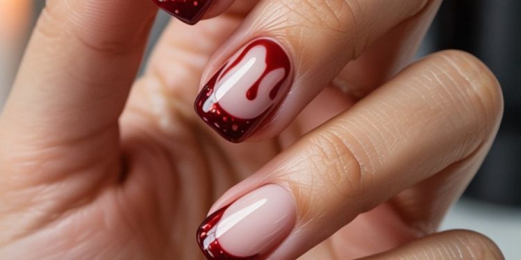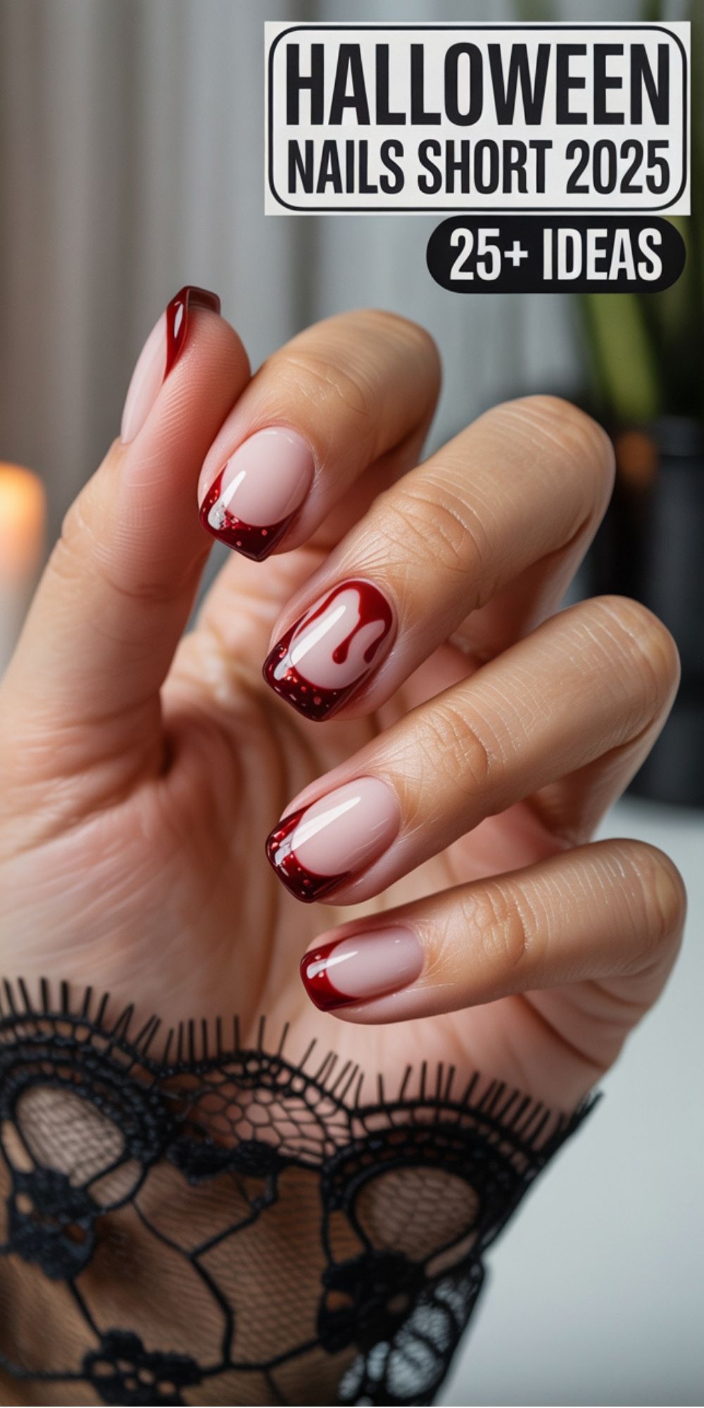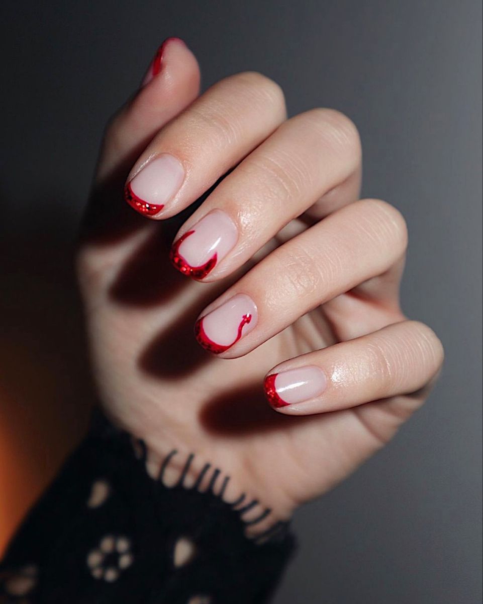 This look redefines red and black horror with a simple French tip twist. Short square nails with nude bases are tipped in glittering red, with dripping edges for a bloody spooky effect. It’s theatrical but classy, easy to wear day-to-day if you’re bold enough.