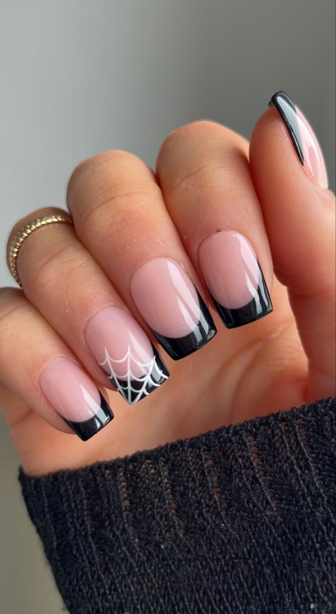 Black will always be a witchy Halloween staple, but this look combines it with clean line art for something stylishly subtle. The alternating black and white combo—solid black nails paired with a nude base carrying spider and web details—creates the perfect simple yet eye-catching balance. Short almond nails would soften the edges of this design, but even on squared tips, it keeps a polished energy. This is wearable for both festive events and everyday life without feeling over the top.