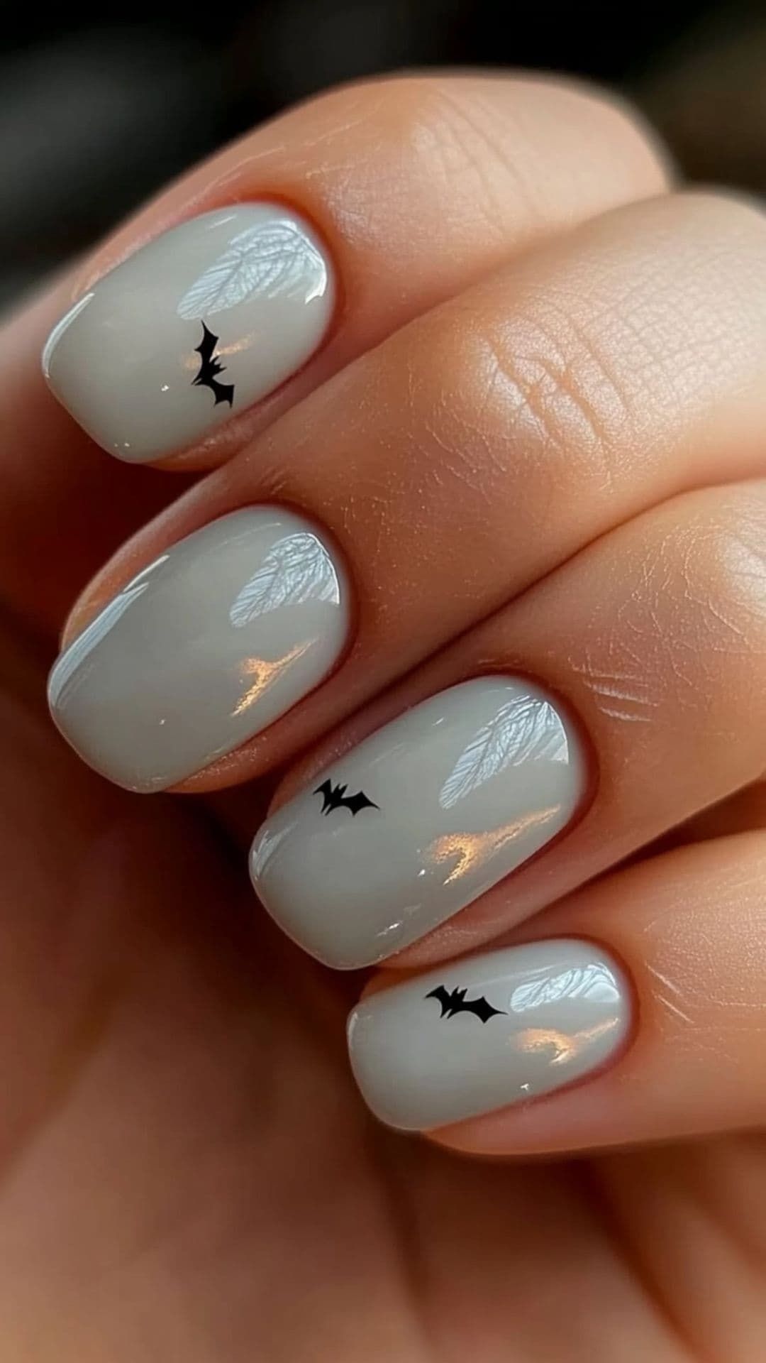 For those who love subtle hints of Halloween, this design is perfection. A cool-toned grey base makes a sleek backdrop for tiny black bat silhouettes. It’s refined, natural, and simple, leaning more toward everyday classy style than costume-like drama. It works well on any nail shape, but short rounded or square tips make it even more understated. Perfect for those who want Halloween nails but still need them to blend with office attire.