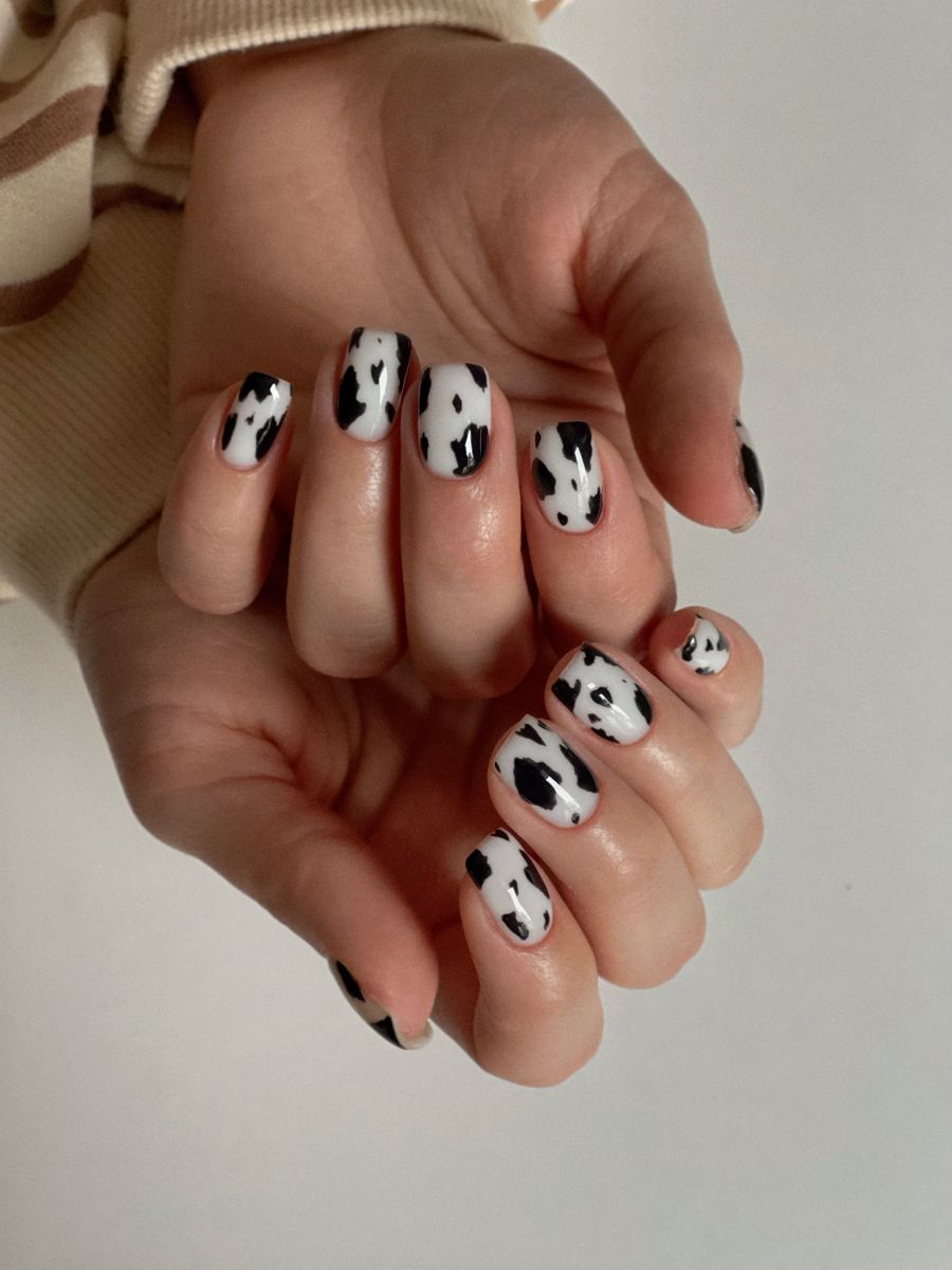 Unexpected, yes—but black and white cow print nails are trending even in 2025 as part of playful fun fashion crossovers. For Halloween, they serve as a quirky alternative to the usual spooky motifs. The look is fresh, girly, and surprisingly classy when paired with neutral outfits. On short nails, the print looks modern and manageable—perfect for casual events, not as much for formal parties.