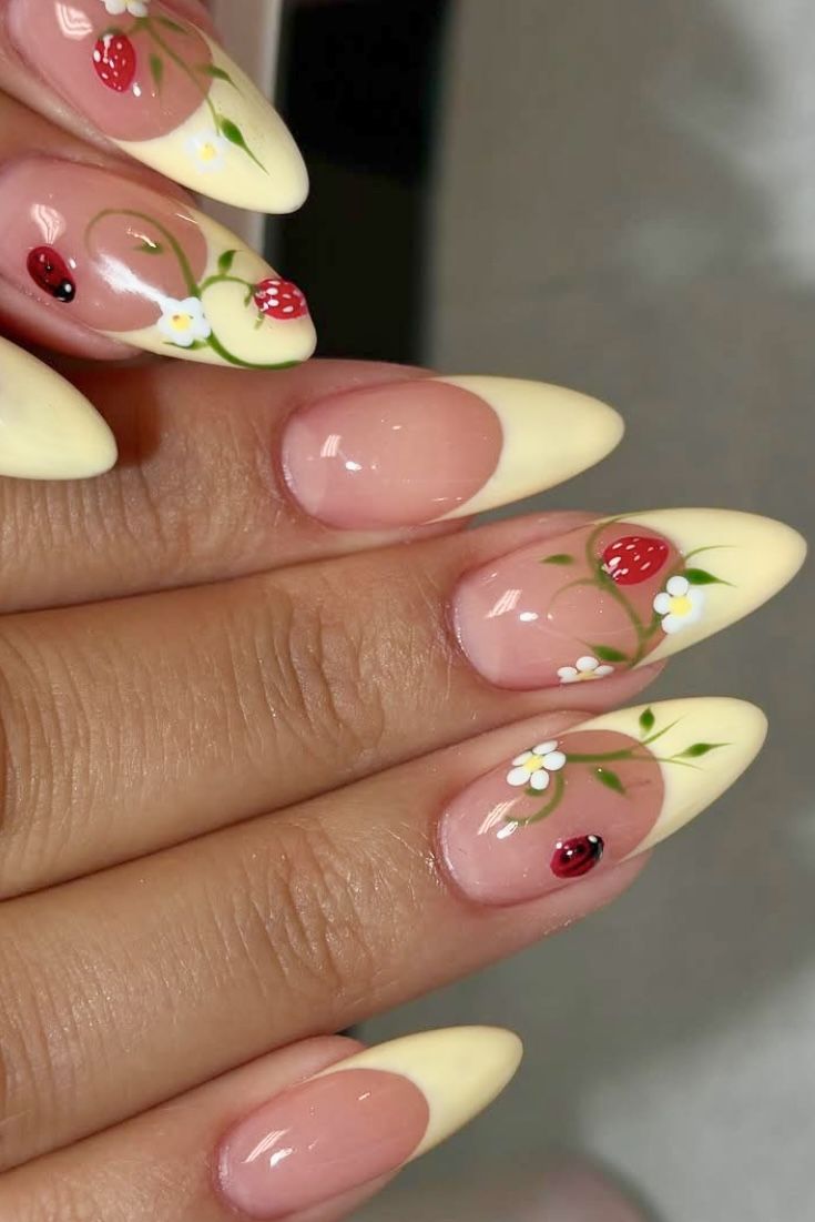 This set leans into a creamy yellow French tip paired with a sheer natural base, instantly giving the manicure a light spring mood. The tiny ladybugs and hand-painted flowers feel delicate rather than childish, thanks to the elongated almond shape. This style works beautifully for slim to average fingers, as the pointed length visually elongates the hand. It’s less ideal for very short nail beds unless the length is adjusted. Practical? Surprisingly yes — the pale tips hide chips better than stark white and feel wearable for everyday life, brunch dates, or garden weddings.