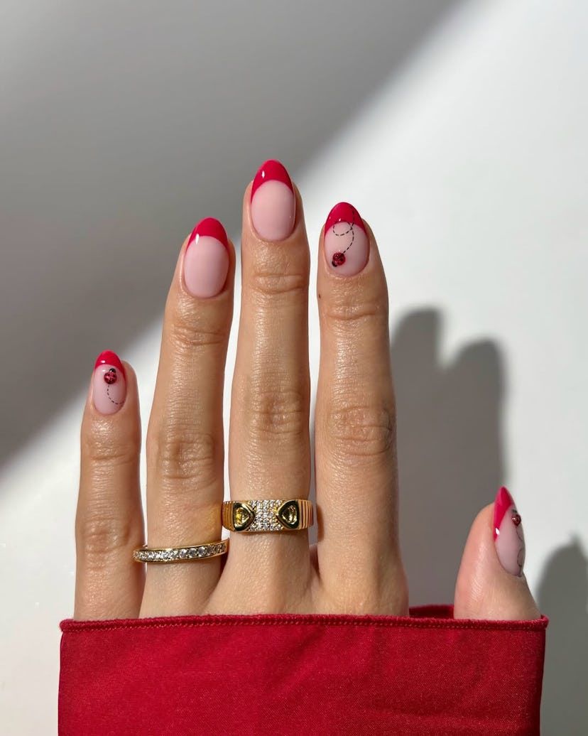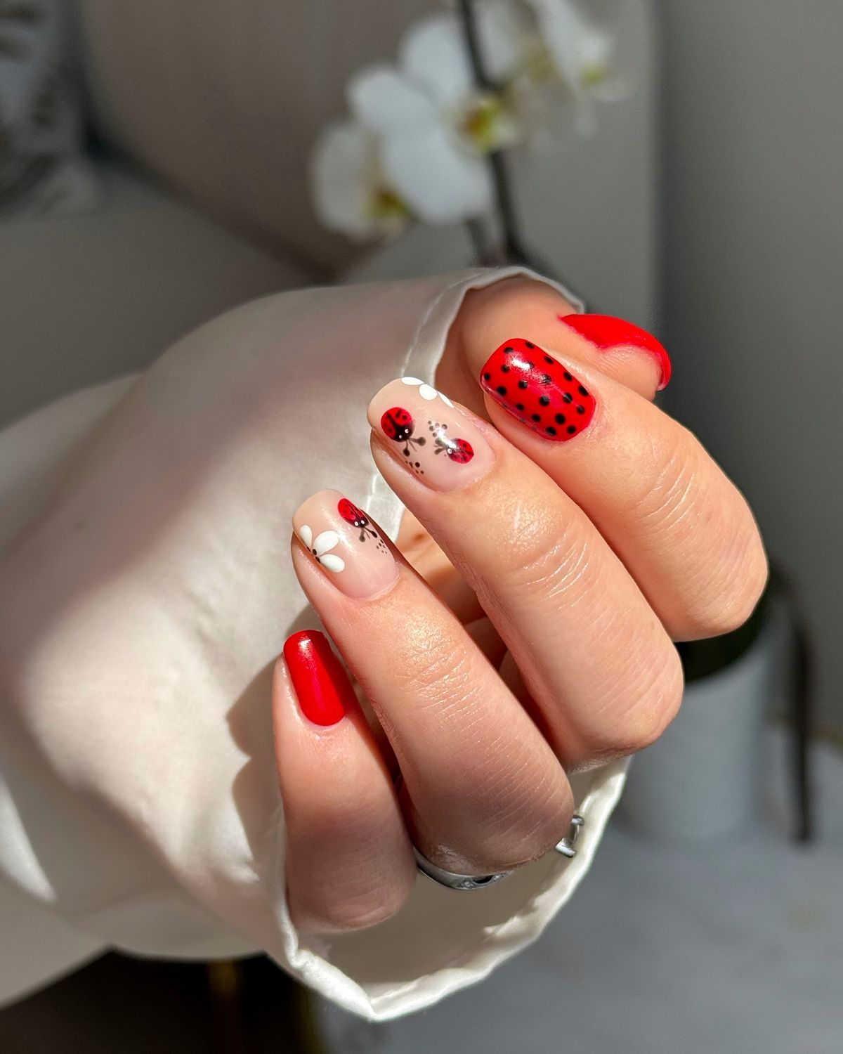 I wouldn’t add extra colors here. No blue, no glitter. The balance between red and nude is the magic. If you want variety, alternate which finger gets the ladybug — that’s enough.