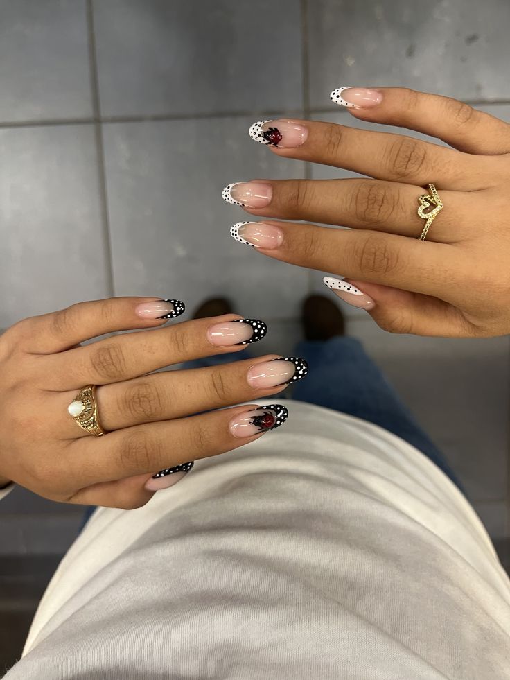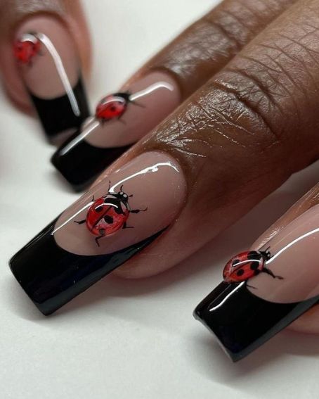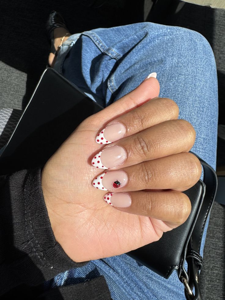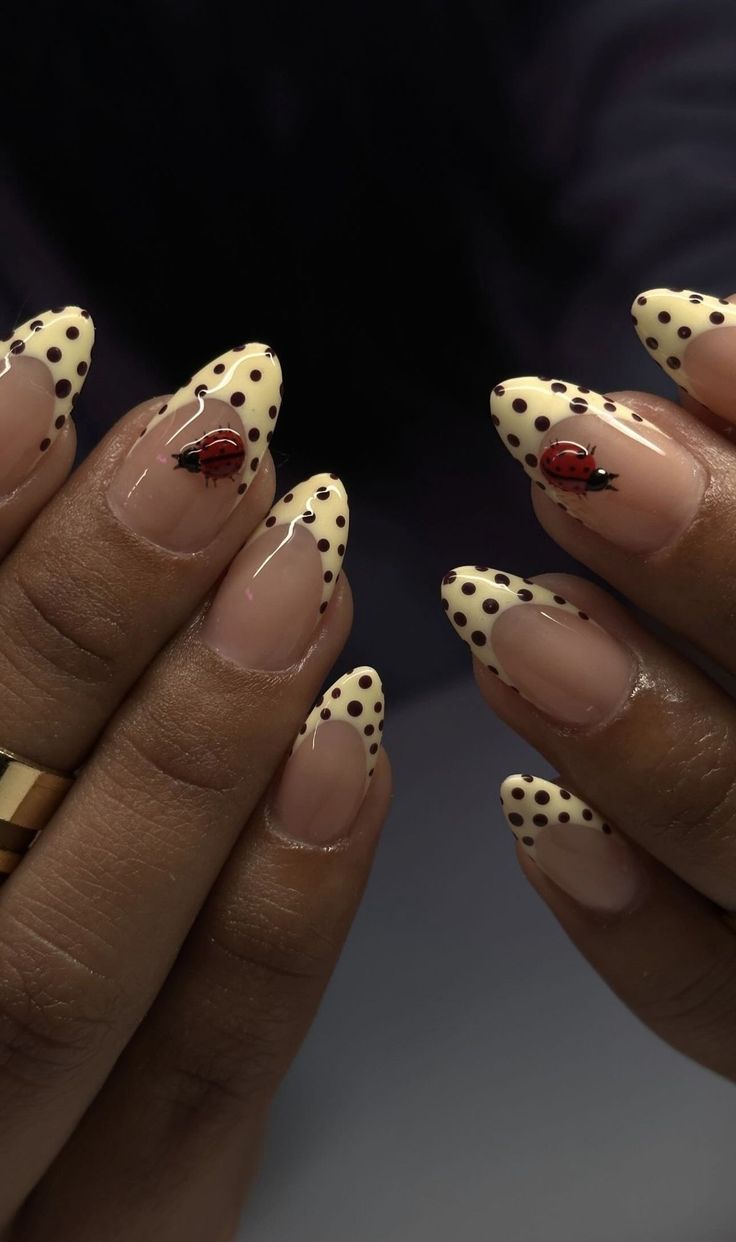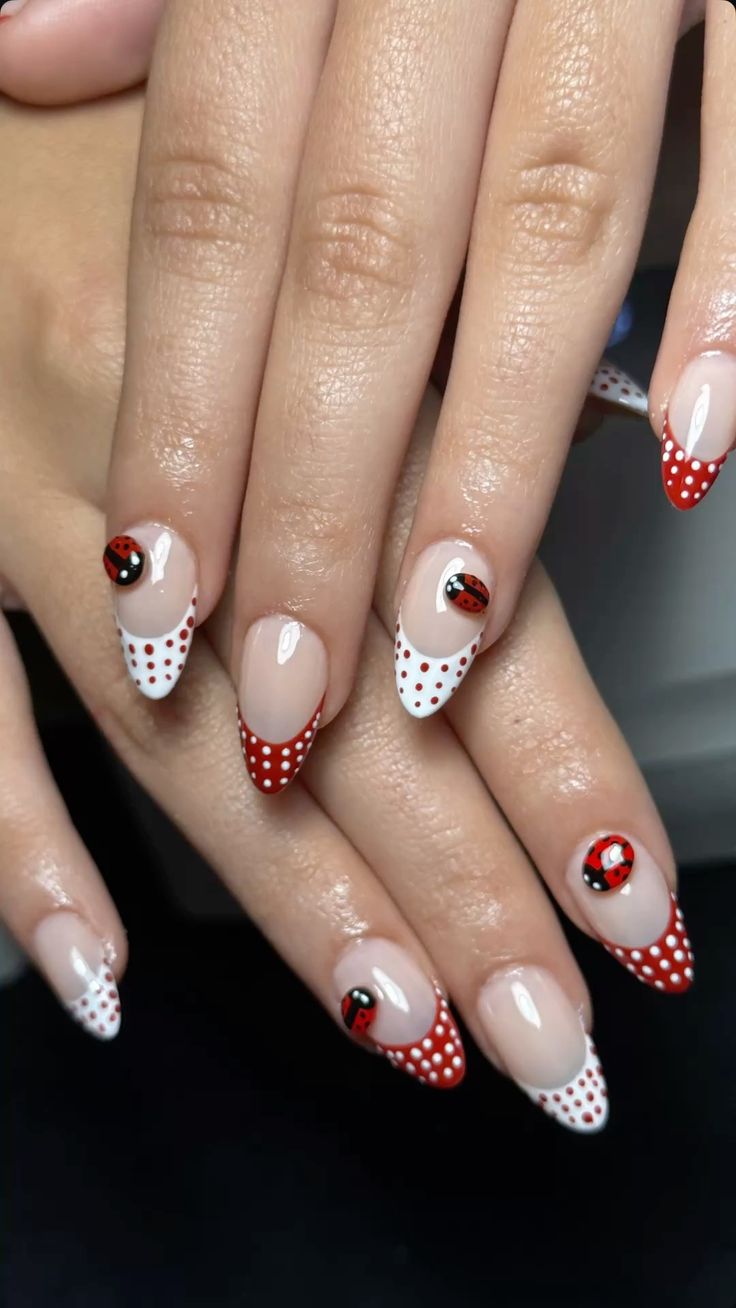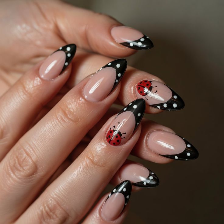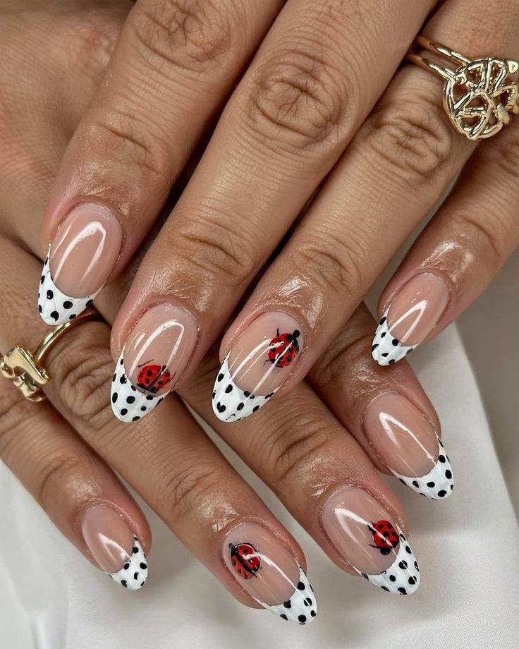 This is the most dramatic look of the lineup. Black French tips with white dots and vivid ladybugs feel chic, slightly moody, and very 2026. The almond shape works best on longer fingers, as the dark tips can visually shorten the nail otherwise. Perfect for evenings, fashion-forward offices, or monochrome outfits.