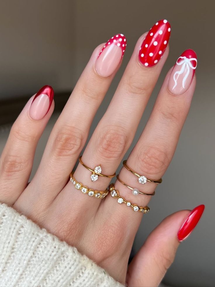 I’d skip adding metallics or crystals here. If anything, switching one red nail to a soft pink could soften the contrast even more.