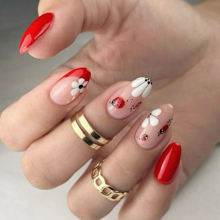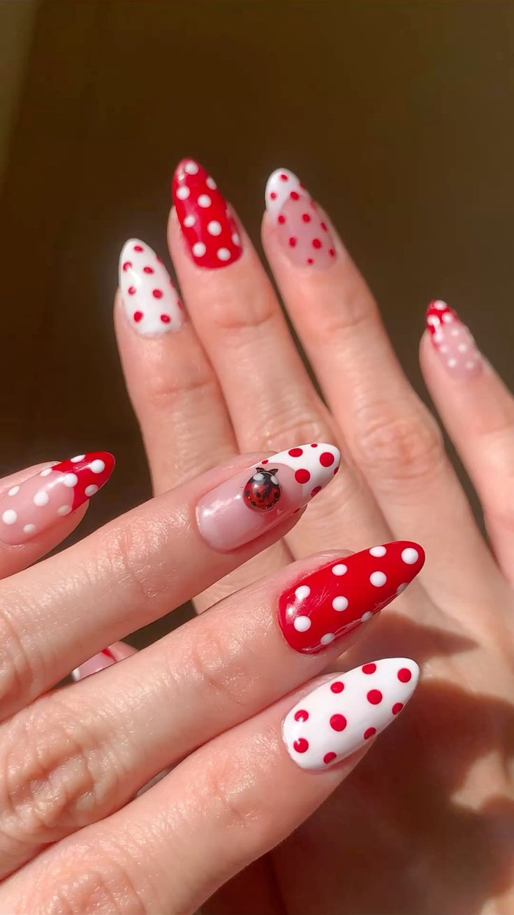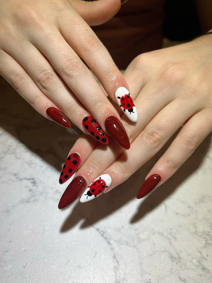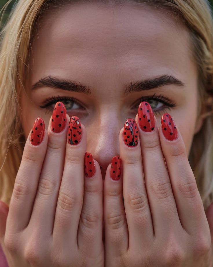 This manicure mixes solid red nails with patterned accents featuring ladybugs and dots, creating a playful rhythm across the hand. The shape leans slightly oval, making it a great option for those who prefer comfort over drama. This style feels perfect for daytime events, casual dinners, or creative social settings — less so for minimalist dress codes.