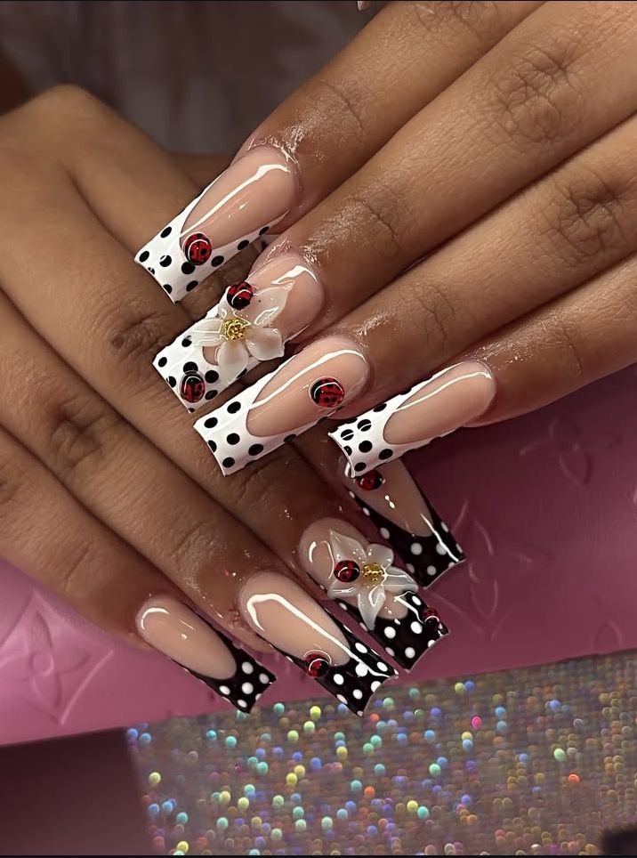 This look plays with contrast in the smartest way: crisp white French tips scattered with black polka dot details and tiny ladybugs resting on a neutral base. It feels graphic yet feminine, almost retro. The medium long length suits both short and long fingers, making it surprisingly universal. It’s practical for everyday wear and totally appropriate for work environments that allow creative beauty choices.