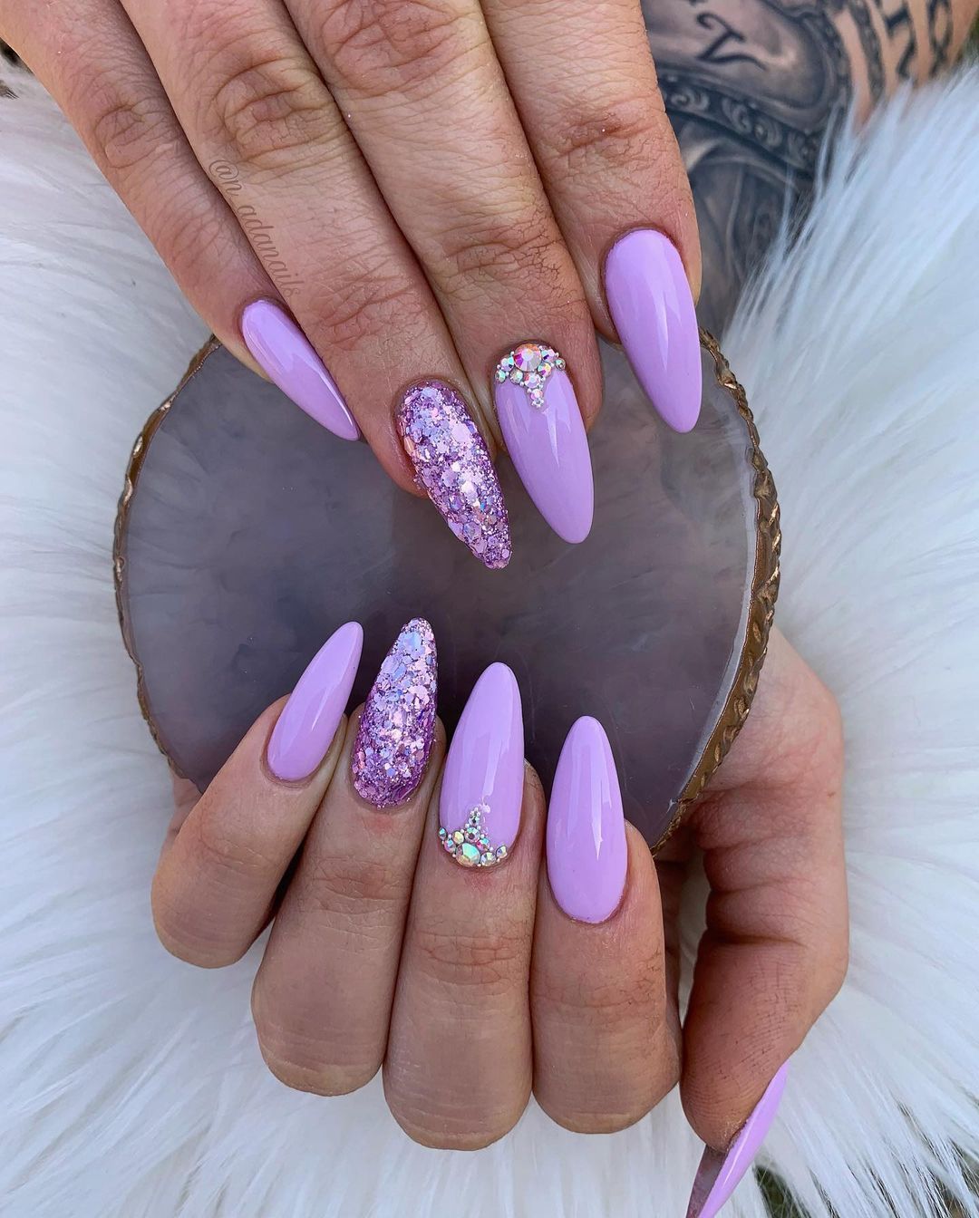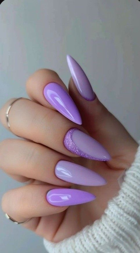The elongated almond silhouette here feels elegant without being overly dramatic, and the harmony between deeper lilac and soft pastel purple creates a gradient that’s subtle yet dimensional. This style works beautifully for medium to long nail beds, especially if you love femininity without heavy ornamentation. It’s appropriate for everything from everyday wear to quince, prom, and even elevated summer outfits thanks to its clean shine and smooth structure. The look is not ideal if your daily routine involves heavy hands-on work — the length may feel impractical.