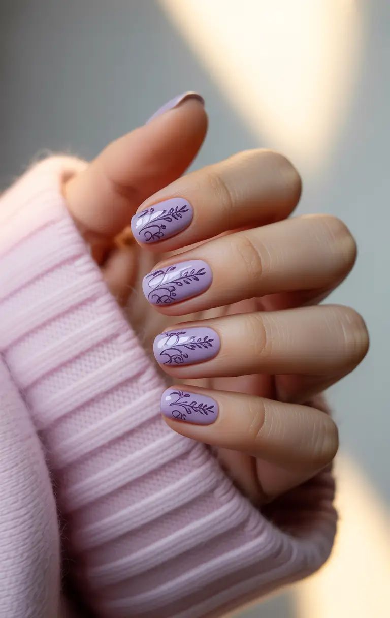 Soft lilac meets delicate botanical artwork for a manicure that feels poetic, gentle, and quietly expressive. The short-to-medium rounded shape is especially flattering for most hand types and very practical for daily tasks. This is a perfect choice for lovers of flowers, soft sweaters, and calming aesthetics. It’s wearable in every season, though it shines especially in spring.
