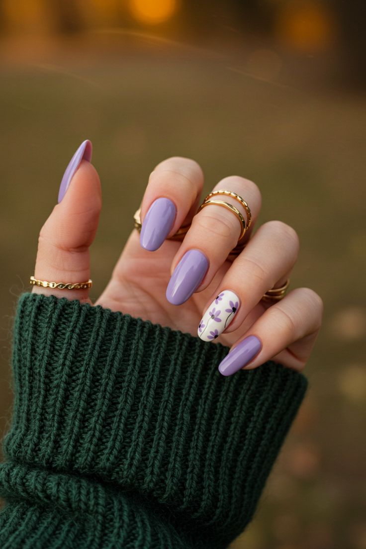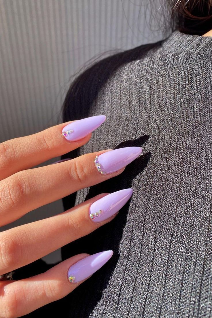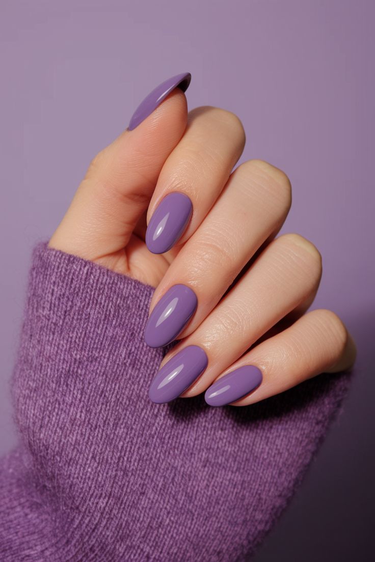 This is the most classic interpretation: soft oval nails coated in pure pastel purple, glossy and timeless. This shape is ideal for anyone wanting something gentle and natural-looking — the oval silhouette flatters every hand type. It works for everyday wear, office days, interviews, prom, and even winter minimalism. There’s nothing here that distracts; it’s clean, calm, and deeply wearable.