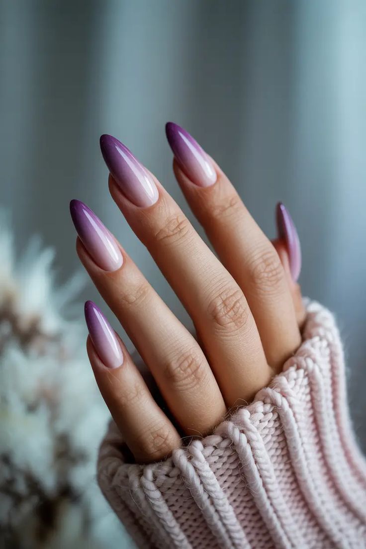 A dreamy gradient that fades from a sheer natural tone into a deeper purple—softly atmospheric and ideal for summer, transitional weather, or evening events. The elongated almond silhouette enhances the vertical fade, giving the illusion of longer fingers. This is a particularly flattering choice for anyone with shorter nail beds, as the ombré adds visual length. It might not be ideal for someone who prefers ultra-short nails, but for elegance, this design delivers.