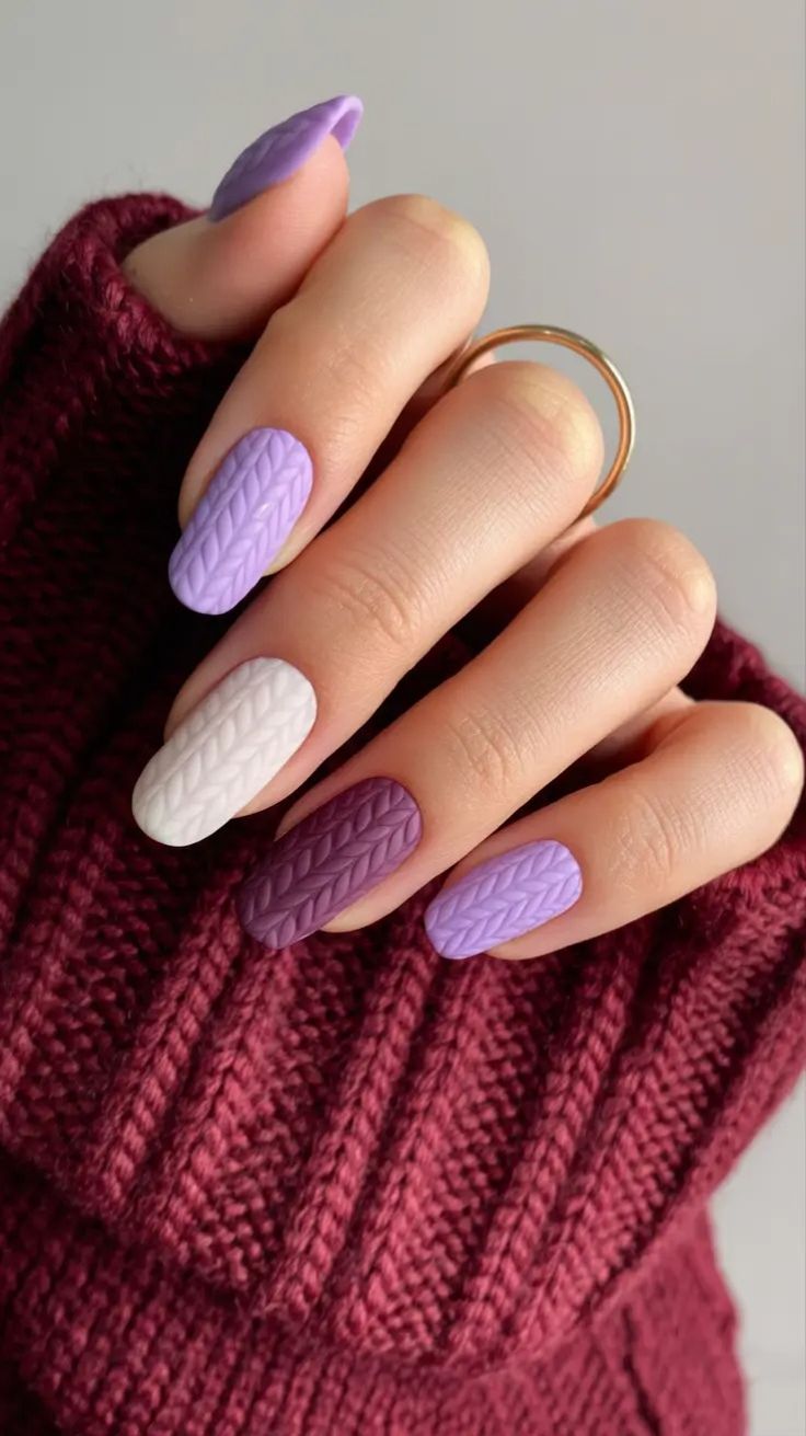The knitted-texture manicure is one of those looks that instantly warms you up—literally and aesthetically. Here, a mix of pastel purple, creamy white, and deeper plum tones creates a charming, layered story. The raised cable-knit effect mimics cozy winter sweaters, making this style ideal for colder months or anyone who adores tactility in beauty. This look works beautifully for medium and long nail lengths and suits square or almond tips, but it may feel a bit heavy for very short nails due to its three-dimensional detail.