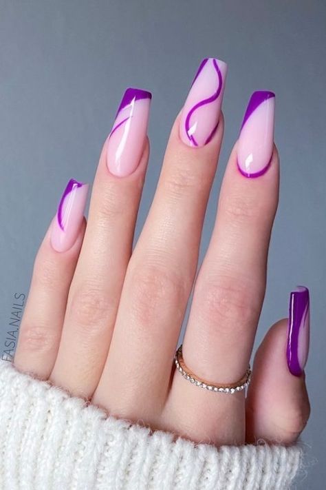 Deep, vibrant purple curve lines frame the tips, creating a purple and pink story that’s bold yet elegant.