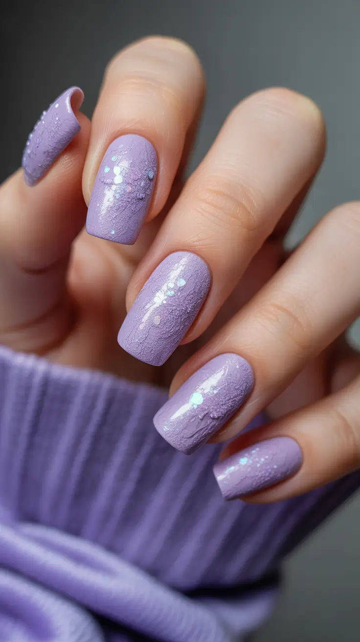 This lilac manicure is soft, dreamy, and slightly whimsical thanks to its textured matte surface paired with scattered glitter speckles. The look feels almost frosted, like a winter morning where everything sparkles in the cold air. The texture makes these nails incredibly practical for everyday wear—they hide minor imperfections and feel naturally durable. Perfect for those who prefer simple manicures with personality but don’t want high-maintenance shine.