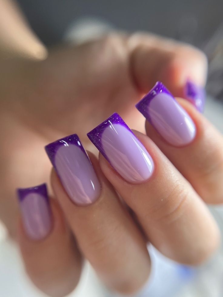The pastel purple french tip creates a delicate color pop without overpowering the nude base.