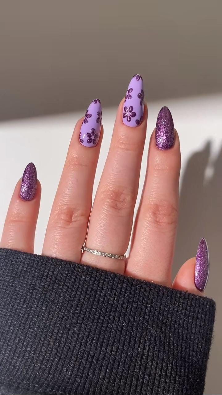 This set mixes matte pastel lilac with glossy glitter nails and dark flowers, creating a dramatic yet playful moment. The elongated shape can visually lengthen the fingers, making it flattering for most hand types, though someone with a very active routine may find the length challenging. This look is ideal for prom, evening outfits, or winter glamour where sparkle compliments the season. It isn’t the best fit for minimalist lovers, since the design goes full-expression.