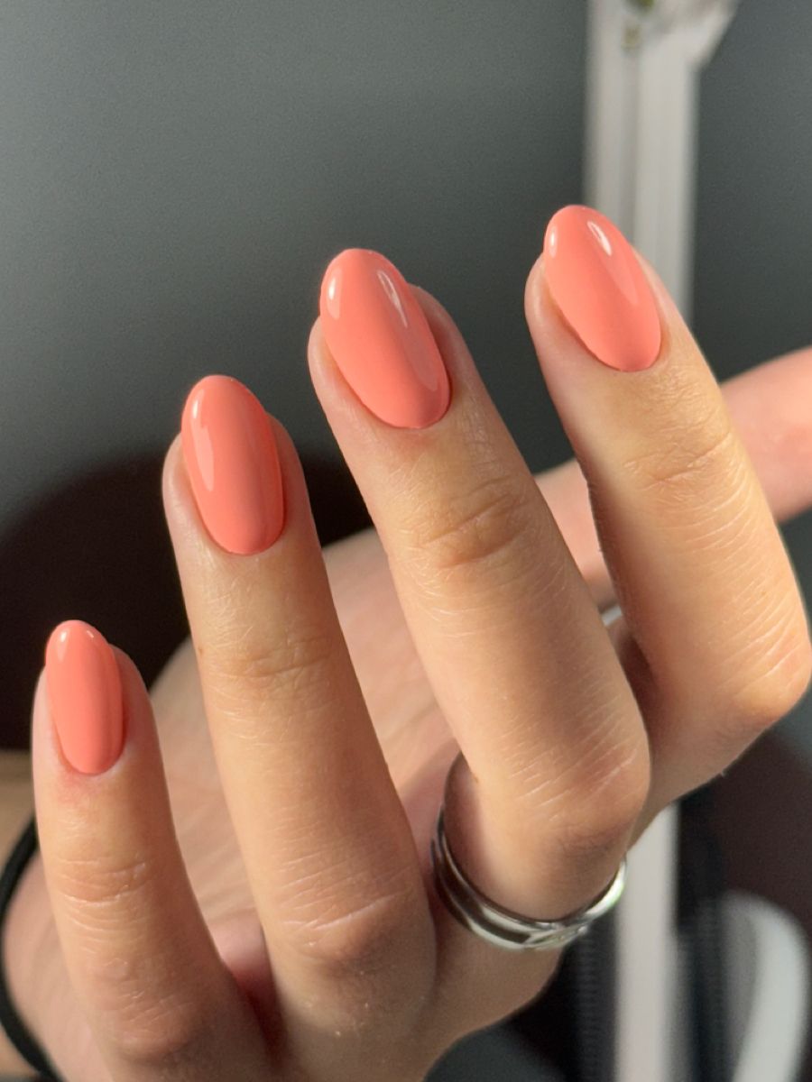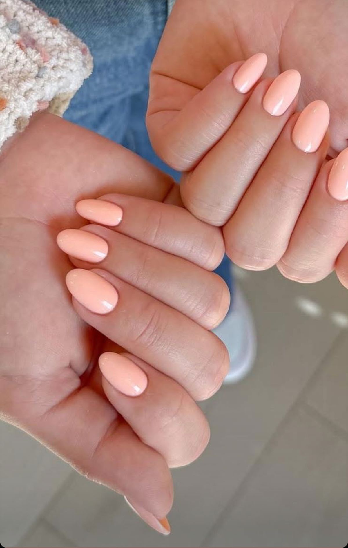 Here’s a manicure that captures the heart of pastel elegance. This shorter almond shape offers comfort without losing its refined charm. The color—a muted peach with just enough light to feel luminous—makes it an excellent pick for daily wear, especially in spring. It’s practical, breathable, and suits almost every hand type, including shorter nails.