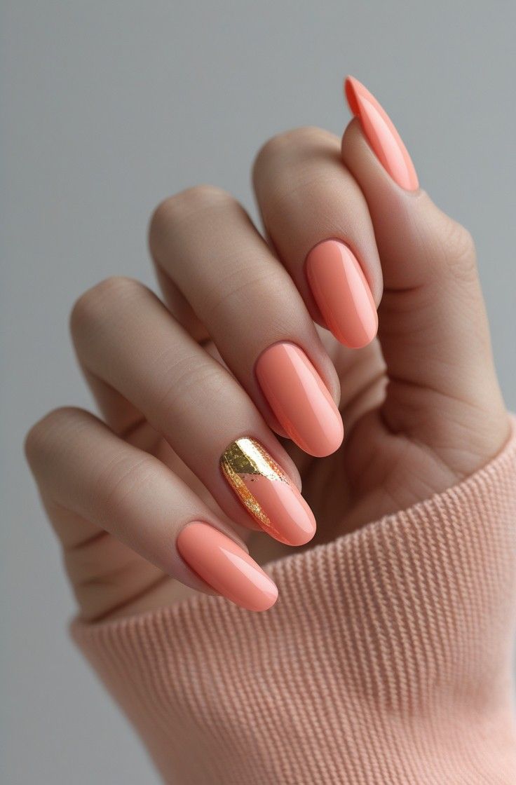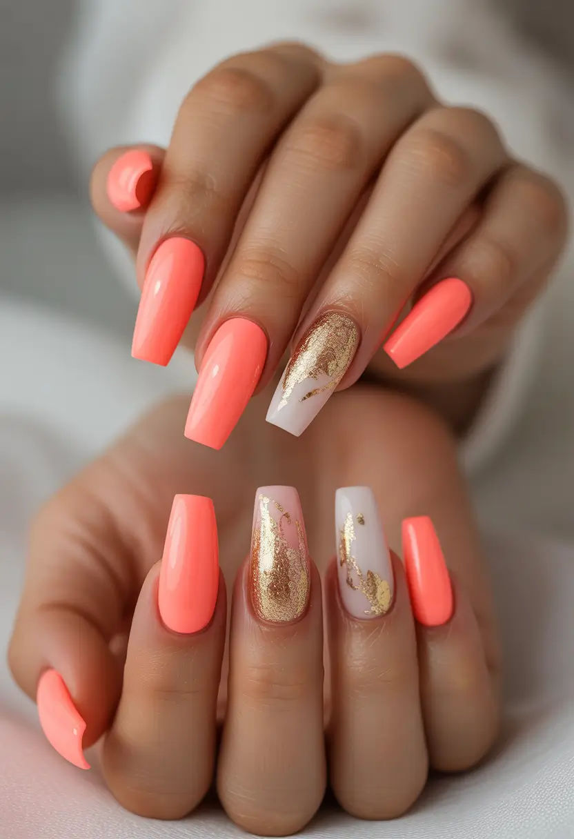The first look is a bold reimagining of peach through a coral-infused tone that radiates energy and joy. The nails feature a square shape that elongates the fingers, while two accent nails introduce delicate gold foil detailing—a hint of art design that feels both regal and modern. The reflective finish gives off a light, mirror-like glow, making it a perfect choice for summer parties, beach vacations, or even chic city brunches. It suits both medium and darker skin tones beautifully, but might appear slightly overpowering on very pale complexions.