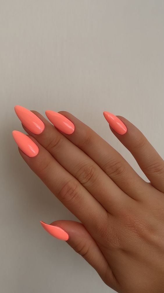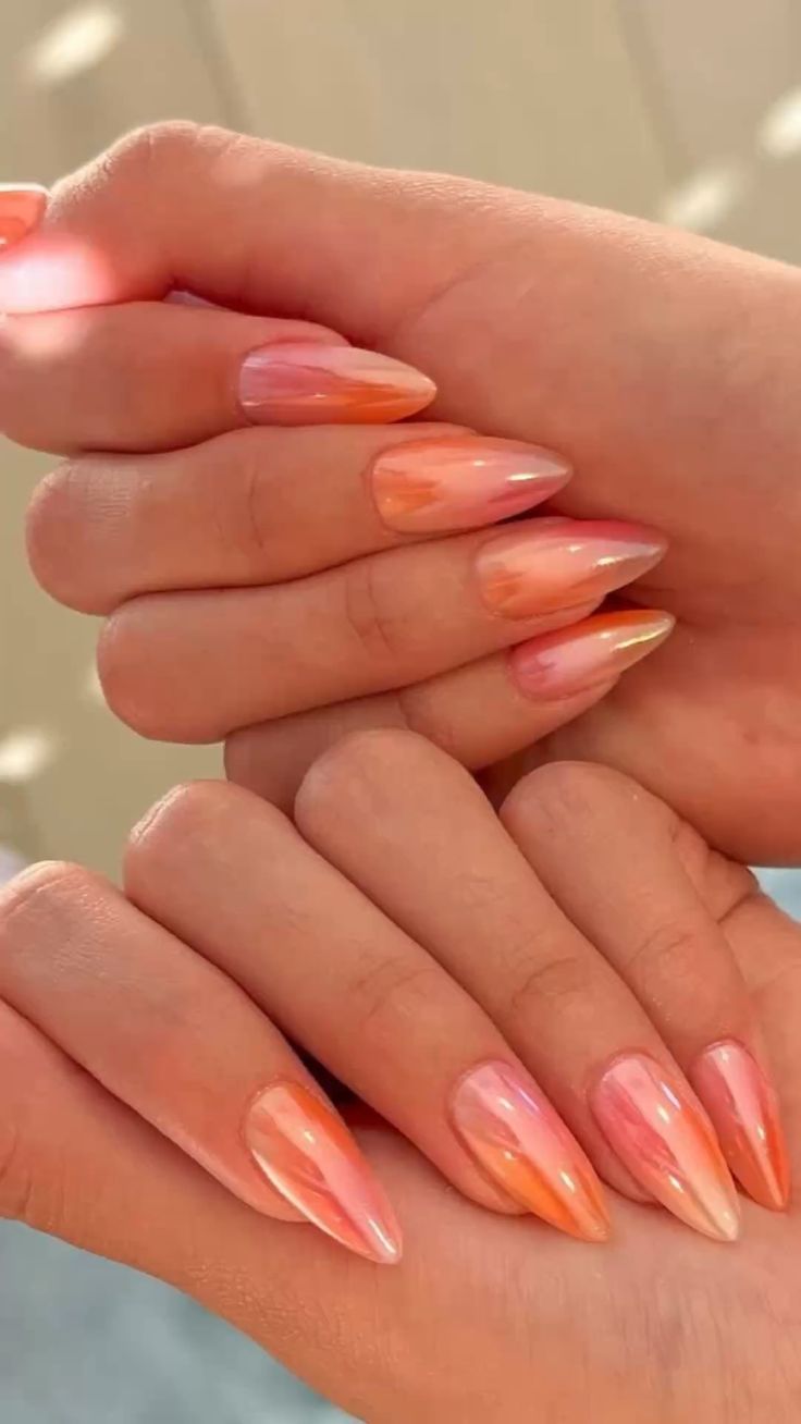 An absolute showstopper. This ombre effect blends juicy pink and orange tones for a glossy, almost candy-like finish. The elongated almond shape enhances its dreamy glow, while the soft light reflection makes it appear liquid and ethereal. It’s pure summer energy bottled into a manicure—playful yet expensive-looking.
