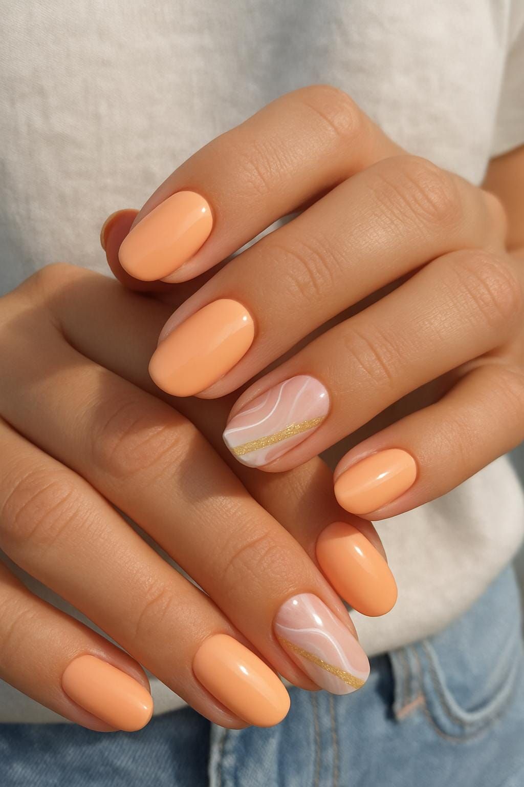 Here’s where art designs meet effortless elegance. This bright and cute manicure blends solid peach nails with soft marble accents, touched by a fine golden stripe. The swirled detailing feels almost fluid, like sunlight reflected on silk. It’s a summer dream for those who adore understated glam — polished enough for weddings, yet relaxed enough for everyday moments.