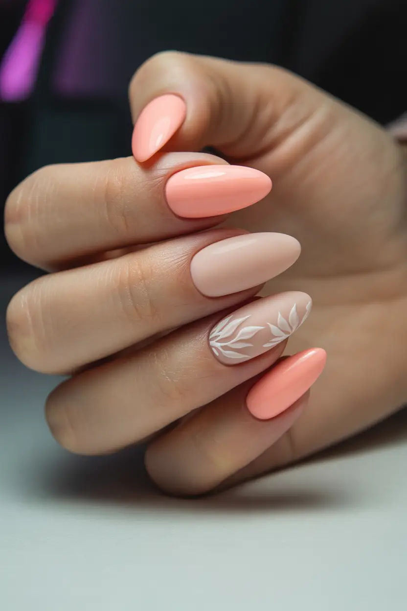 Soft, feminine, and full of personality — this pastel pink and orange combo feels like the gentle start of spring. The design features leafy art designs in deeper coral tones against a creamy light peach base, bringing natural elegance with a modern twist. It’s the kind of cute manicure that brightens your mood instantly.