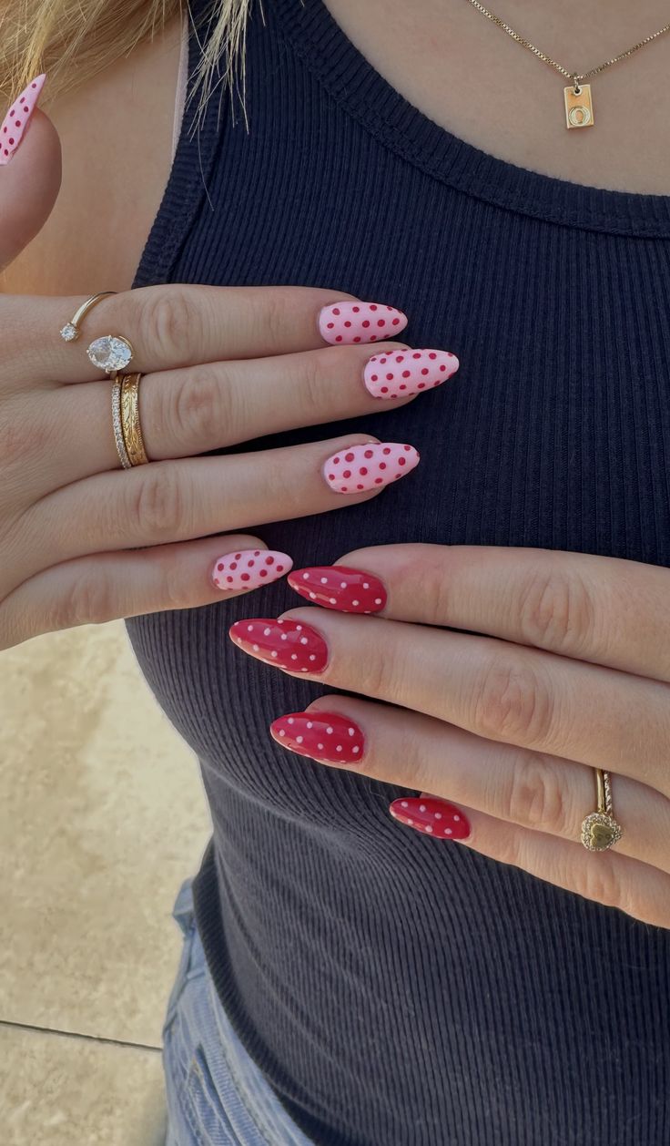 Playful, cute, and brimming with personality, these nails mix light pink and deep dark pink bases topped with polka dots. The medium acrylic almond length makes them noticeable but wearable, especially for weekend outings or casual dates. This look screams youthful inspo, though perhaps less suitable for ultra-formal events.
