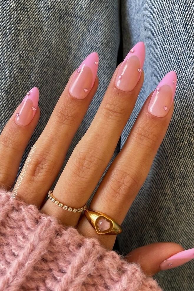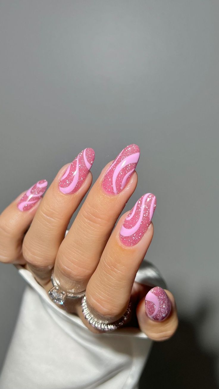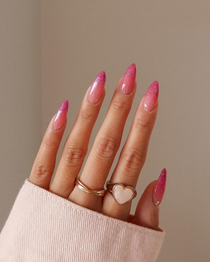 The almond-shaped pink ombré with a dusting of glitter at the tips feels timeless yet trendy. This look suits medium to longer nails, making fingers appear slender and elegant. It’s practical enough for office wear but still sparkly for nights out. If you’re someone who loves balance—professional by day, festive by evening—this style delivers.