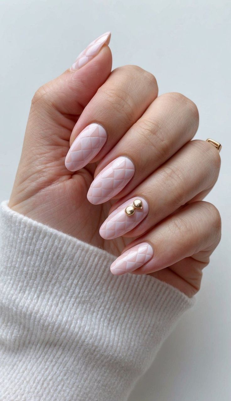 This set is all about texture. A quilted designs art effect over light pink nails creates a fashion-forward vibe that reminds me of Chanel bags. Paired with gold studs, it feels luxurious and high-fashion. The acrylic almond length balances wearability with drama, making it ideal for fashion events, not so much for highly practical everyday work.