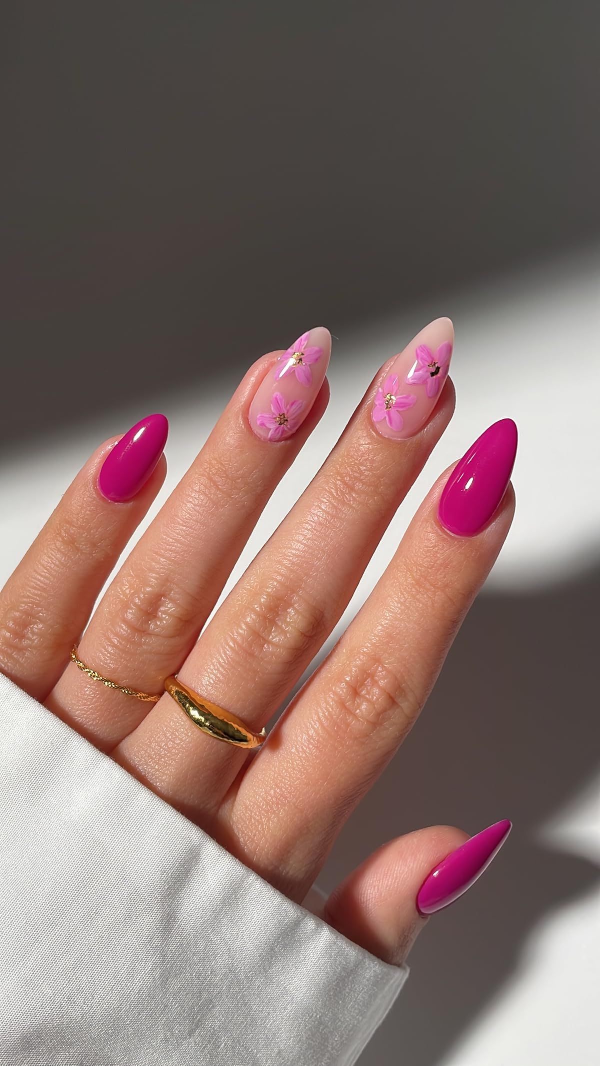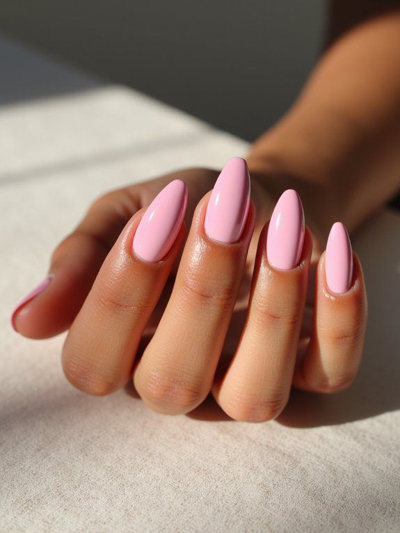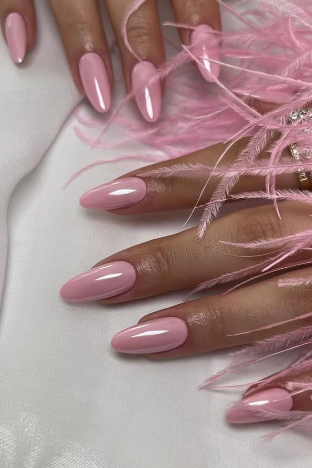 Classic pink almond nails are the kind of inspo you save to your phone for timeless beauty. Not too dark, not too light, this mid-pink shade works for both casual and formal settings. The glossy finish adds a polished edge.