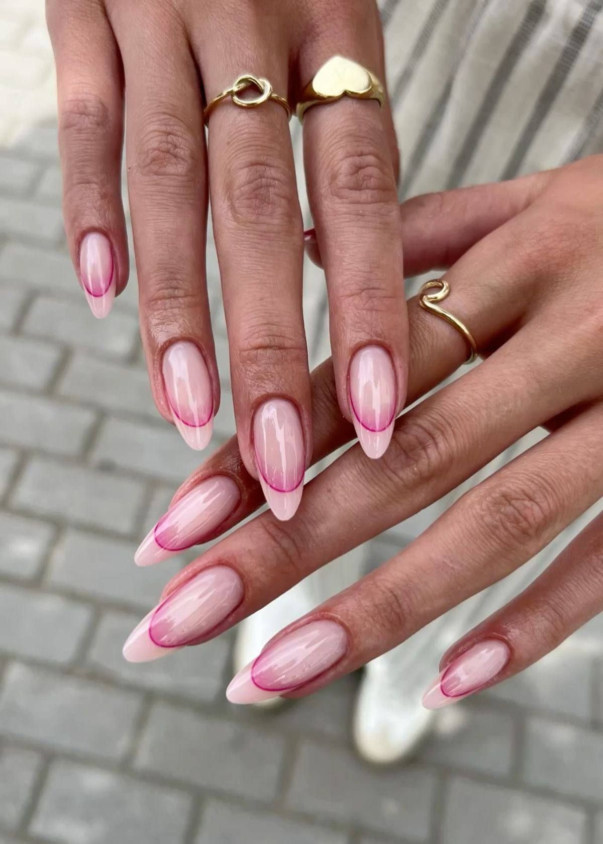 A fresh take on French tips: bubblegum-pink outlines against a pale pink base. It’s youthful, feminine, and super adaptable—you could wear it to brunch, the office, or even date night. Shorter versions work too, especially as short square nails for those who prefer practicality.
