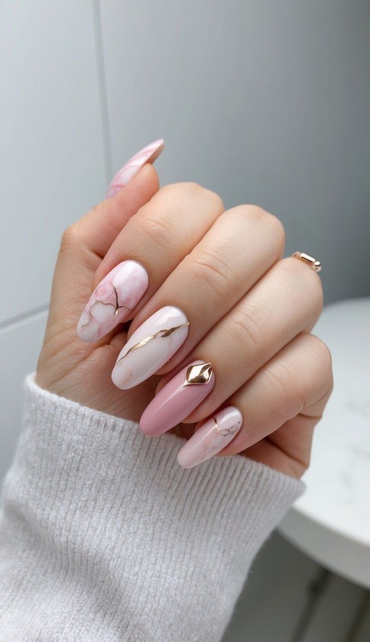 This set is a masterpiece of art, blending soft pink with marble veining and metallic accents. The acrylic almond shape gives the look length and sophistication while still practical for winter parties. The golden detailing elevates the aesthetic, making it a perfect choice for holiday dinners, galas, or even weddings. While this elongated style flatters long fingers, it may feel a little overwhelming for those who prefer short or minimal looks.