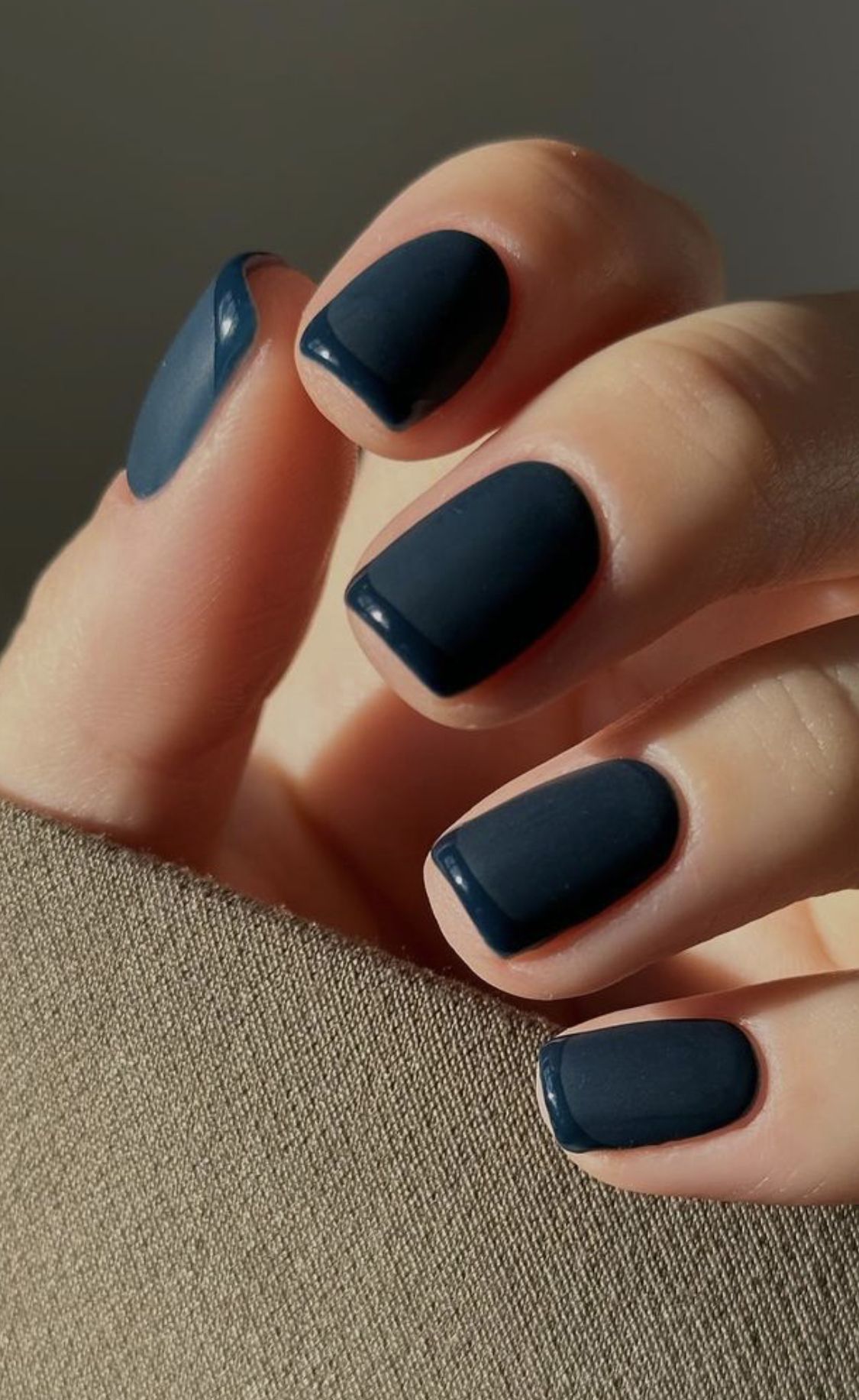There’s something incredibly sleek about this deep navy manicure. The matte finish modernizes the classic blue polish, creating a sophisticated effect that’s both professional and chic. Short, square-shaped nails make it a versatile look: great for work, but also sharp enough for evening outings. It’s a designs easy choice for women who love dark colors but don’t want the intensity of black.