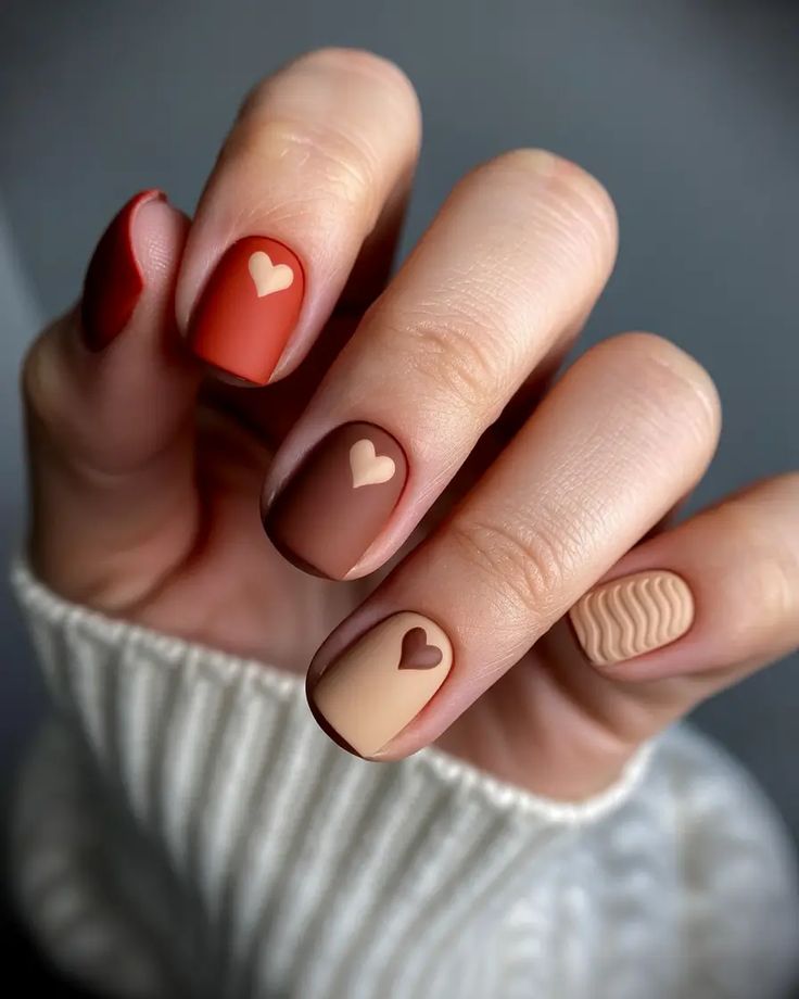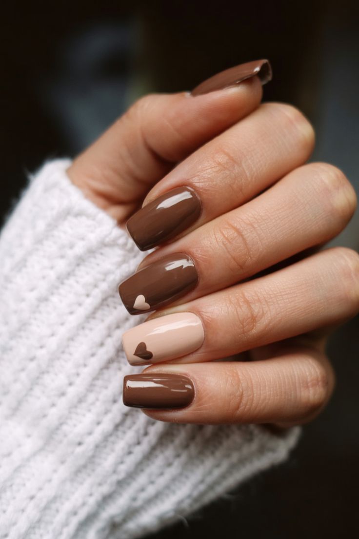 Chocolate brown nails with little heart accents on a beige base feel both cozy and playful. They’re the kind of cute look you’d want for a coffee date or a Galentine’s party. The shades tie into warm winter colors, and the heart art adds just enough charm without overdoing it.