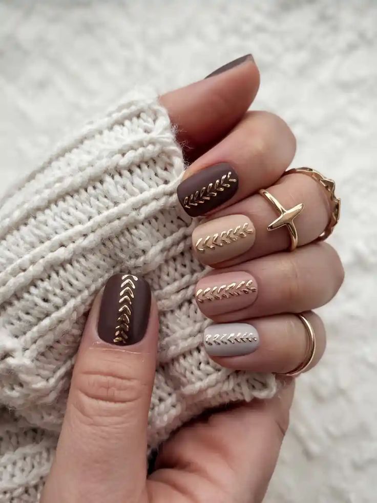 The classic “sweater nail” look brings texture into play. Brown, beige, and taupe nails are elevated with gold knit-style embossing that screams winter coziness. This is one of those ideas simple enough to keep warm but polished, yet it delivers serious art vibes. Perfect for colder climates where your outfit is mostly chunky knits—it ties the whole aesthetic together.