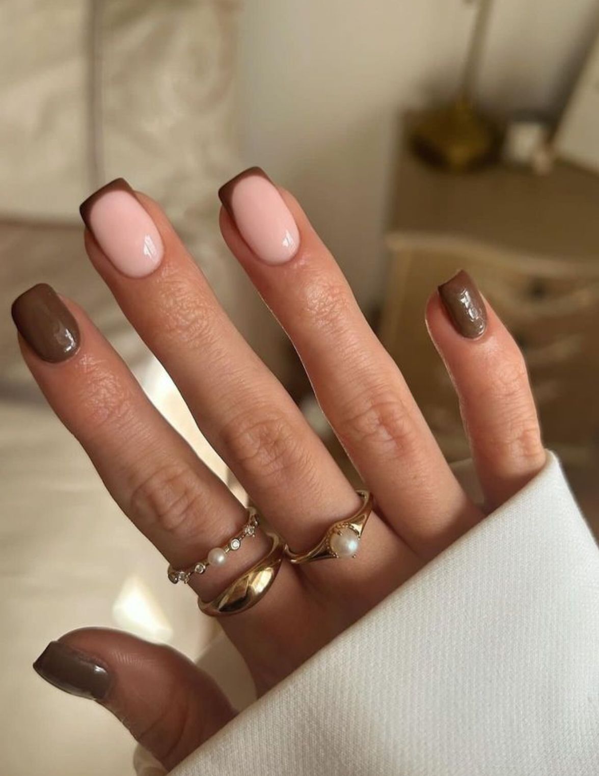 This is a playful twist on the French: alternating between chocolate brown and nude with a brown tip. It’s a cute idea that feels slightly retro but still very now. Perfect for shorter nails and those wanting something easy but not too plain.