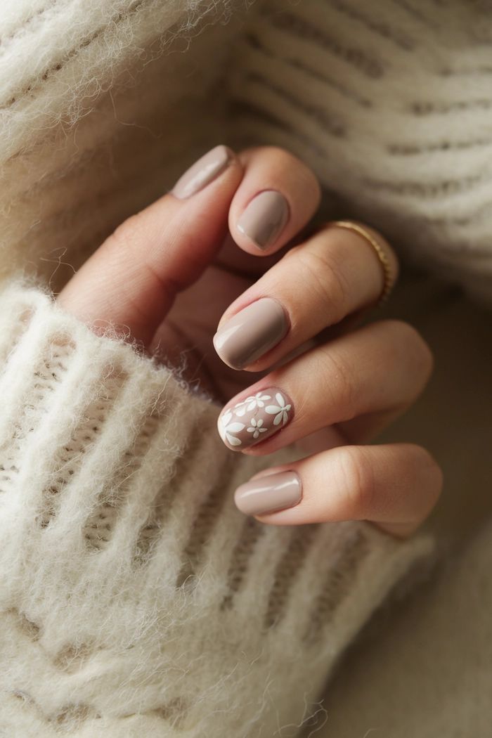 Muted taupe feels like cashmere for your nails—subtle, soft, and luxurious. The single accent finger with dainty white flowers is what keeps it from being too plain. This is an ideas simple style that’s perfect for cozy winter weekends, office days, or intimate dinners. It’s an easy choice if you want just a touch of art without going overboard.
