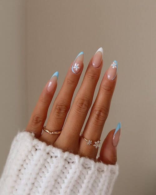 This nail design perfectly blends minimal aesthetics with a touch of springtime whimsy. The almond-shaped nails are painted with a soft nude base, creating a clean and polished look. The tips feature bright pastel blue French accents, a subtle yet playful departure from traditional white tips. To complete the look, dainty white daisies are painted on a couple of nails, making this a simple but standout design.