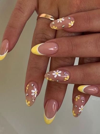 - Design: Yellow French tips with blooming daisies and rhinestone accents.